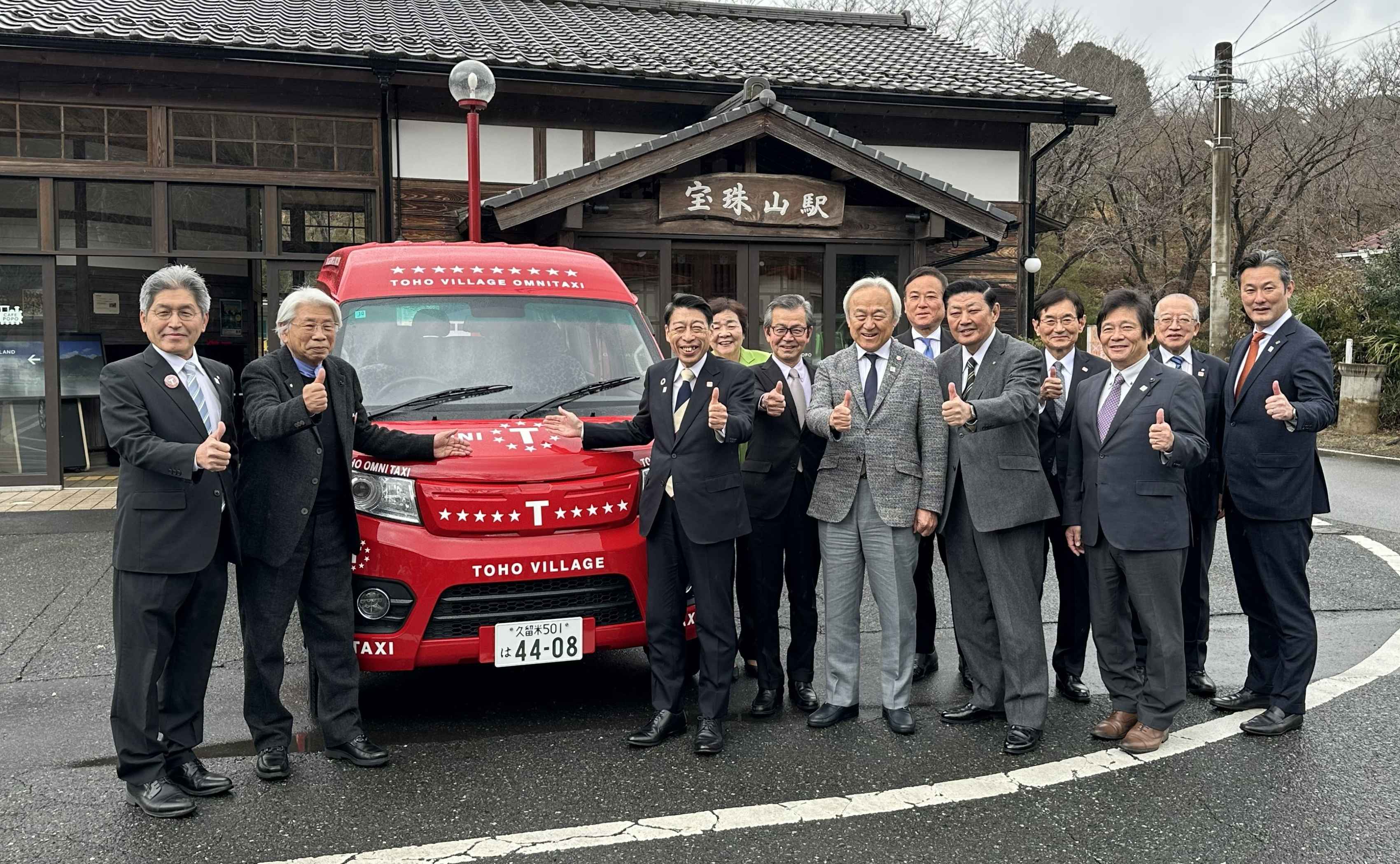 そのような中、2月11日、東峰村において、村内周遊促進を図り、交流人口の増加を目的としたデザイン性の高いEV車両(※)が東峰村乗合タクシー「のるーと東峰」に導入されました。運行を開始するにあたり、宝珠山「こどものえき」において出発式が行われ、当会の名誉会長である福岡県議会の藏内勇夫議長、原口剣生会長、日田彦山線復旧問題対策協議会の松本國寛座長ほか同協議会の多くの委員が参加しました。