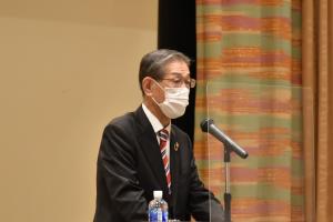来賓を代表し、小川 洋 福岡県知事代理の 服部 誠太郎 副知事から「洋上風力発電は、再生可能エネルギーの中でも非常に規模が大きく、また安定的、効率的でもある。今年2月には、再エネ海域利用法に基づき、響灘沖を促進区域の候補として国に情報提供を行った。今後、この促進区域の指定を国から受けるためには、地域の皆さんのご理解、そして漁業者の皆さんとの合意形成を進める必要があり、国への働きかけも継続して行っていく必要がある。県議会の皆様方には、洋上風力発電を推進する旨の決議をいただいた。さらに超党派の議員連盟も設立をしていただいた。この場をお借りして改めてお礼を申し上げ、また、今後とも引き続きのご支援をお願いする」とのご挨拶を頂戴しました。
